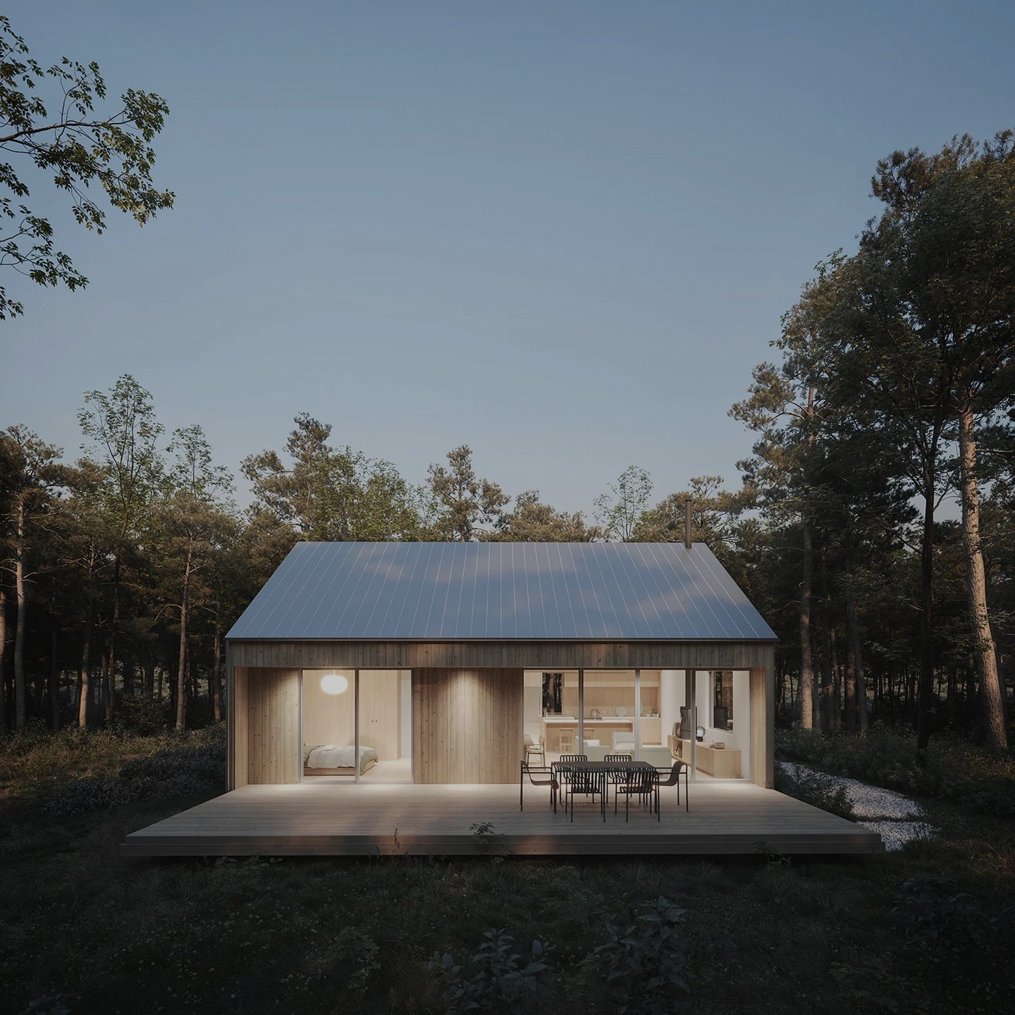 The prefab package starts at $158,850. This includes the panelized construction system, engineered plans, windows and exterior doors, and shipping within the continental United States. Additional costs will include site preparation, foundation, interior finishing, and mechanical systems installation by your local contractor. Taxes and additional fees may apply.