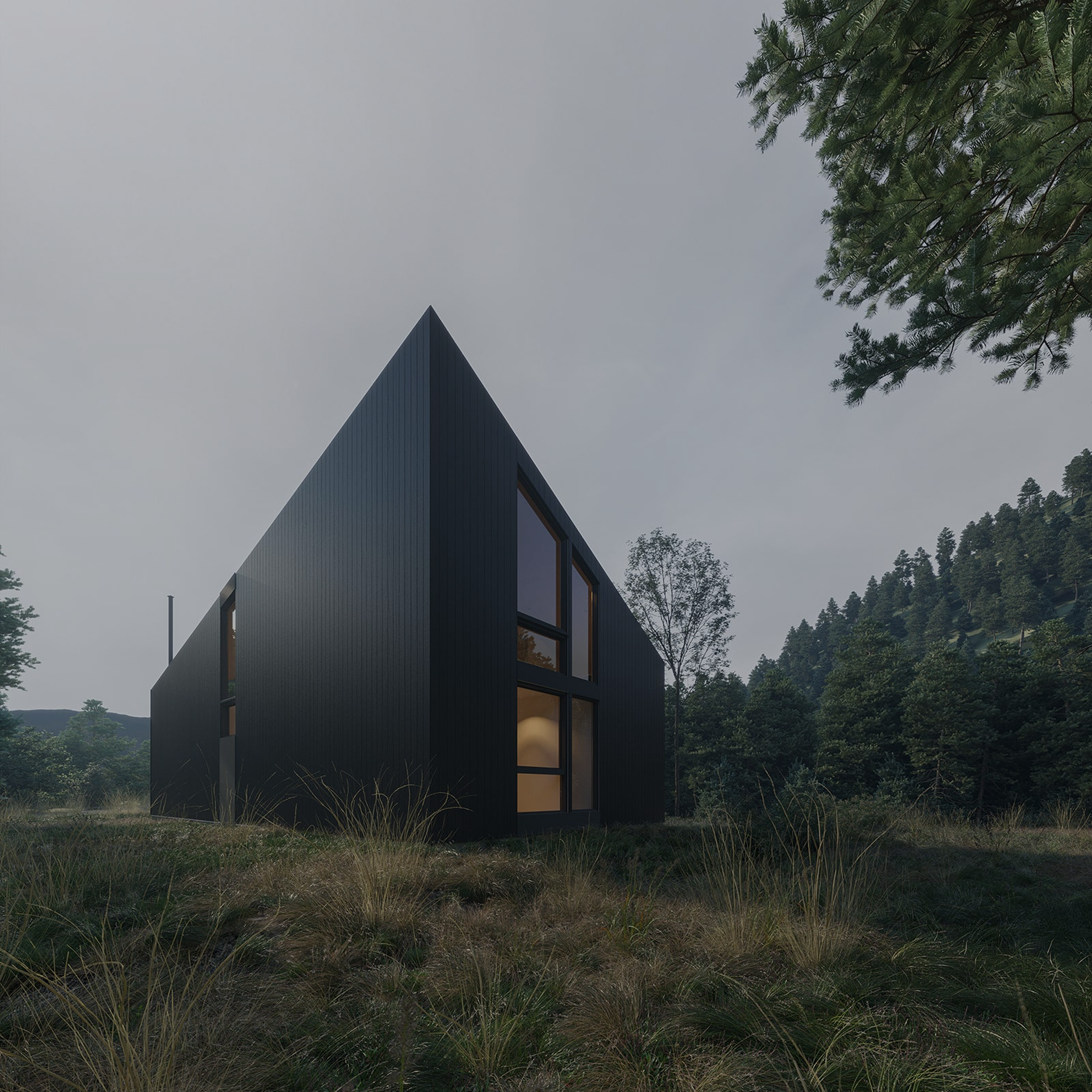 A shapely modern cabin delivered as a fully engineered prefab kit.